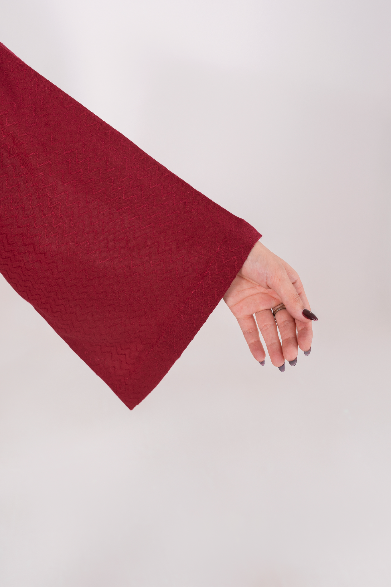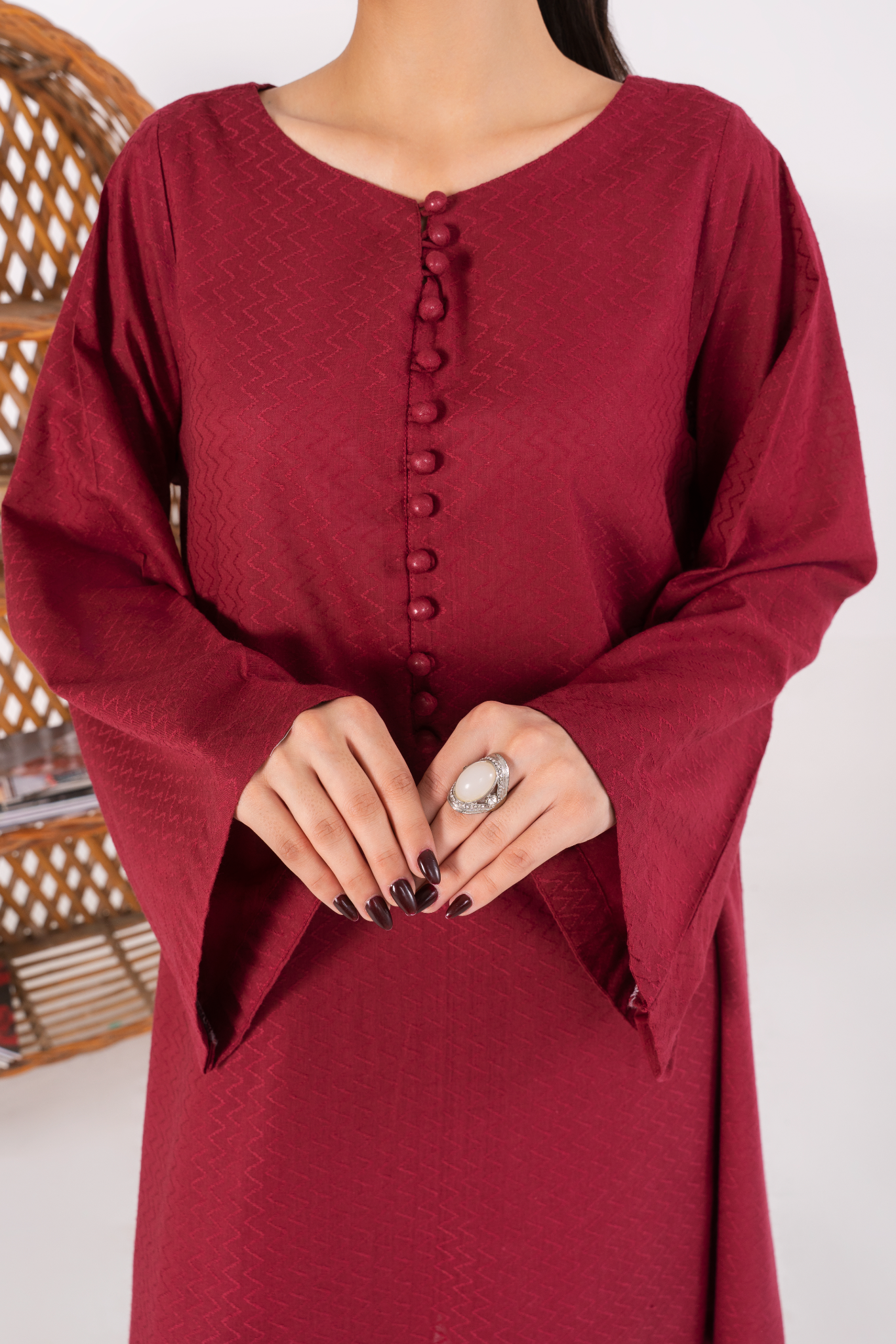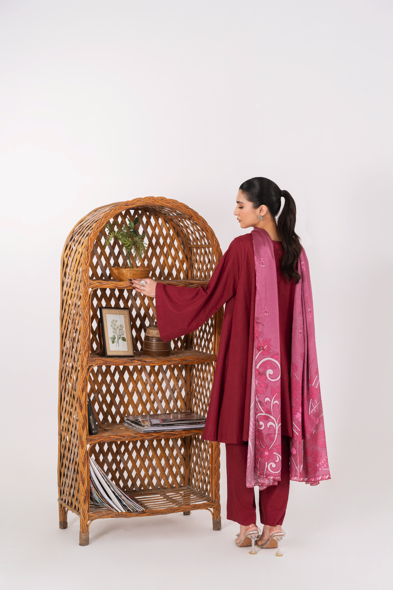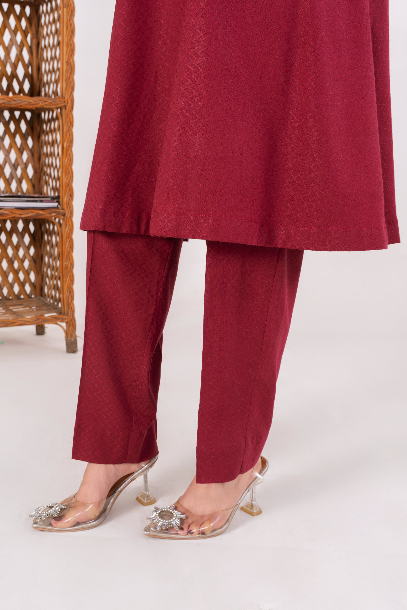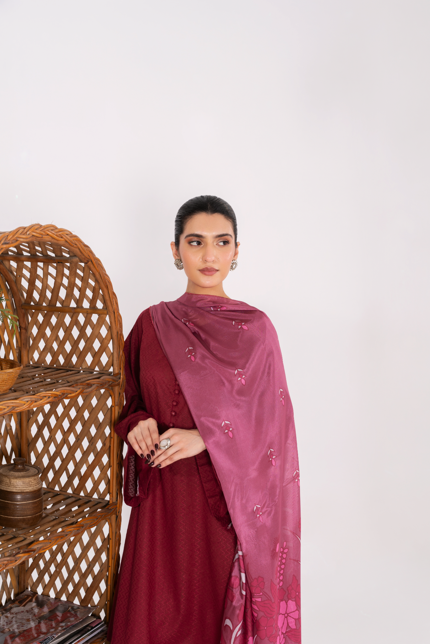 Textured deep pink jacquard with a flowy silhouette, complemented by straight trousers and a printed silk dupatta.