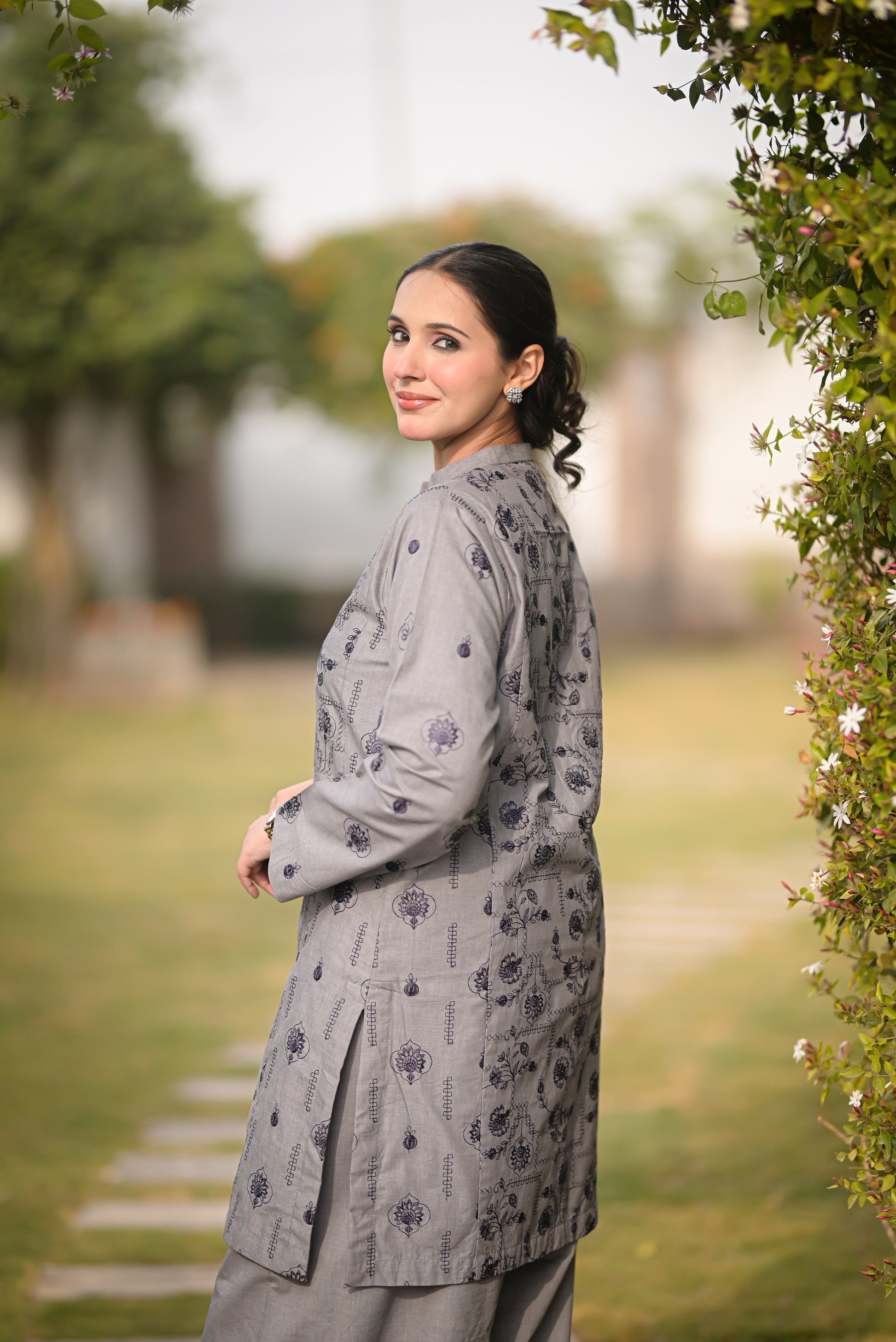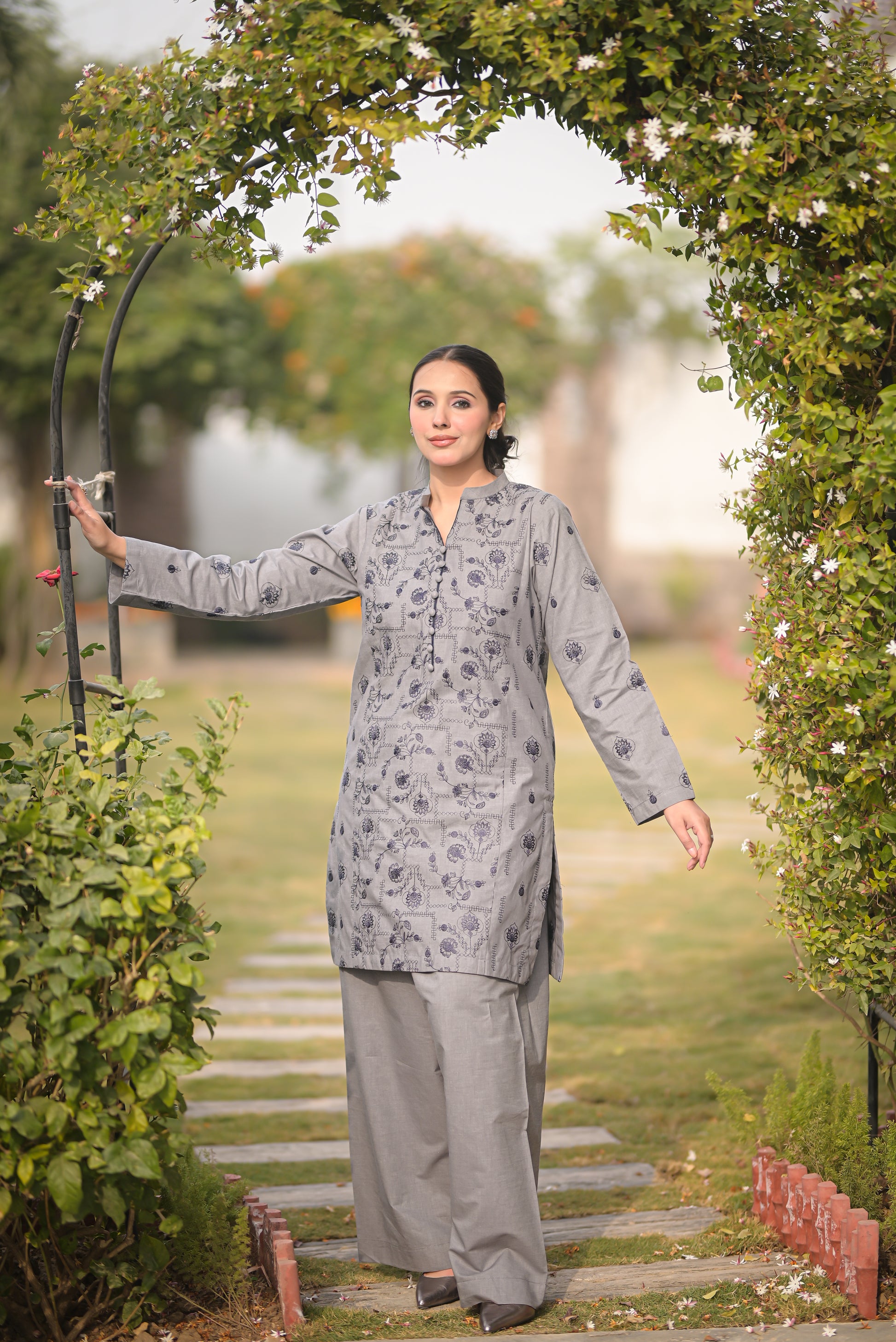 Understated yet chic, this grey ensemble boasts a sleek paneled shirt with delicate embroidery and a relaxed shalwar. A minimalistic look with a touch of luxury.