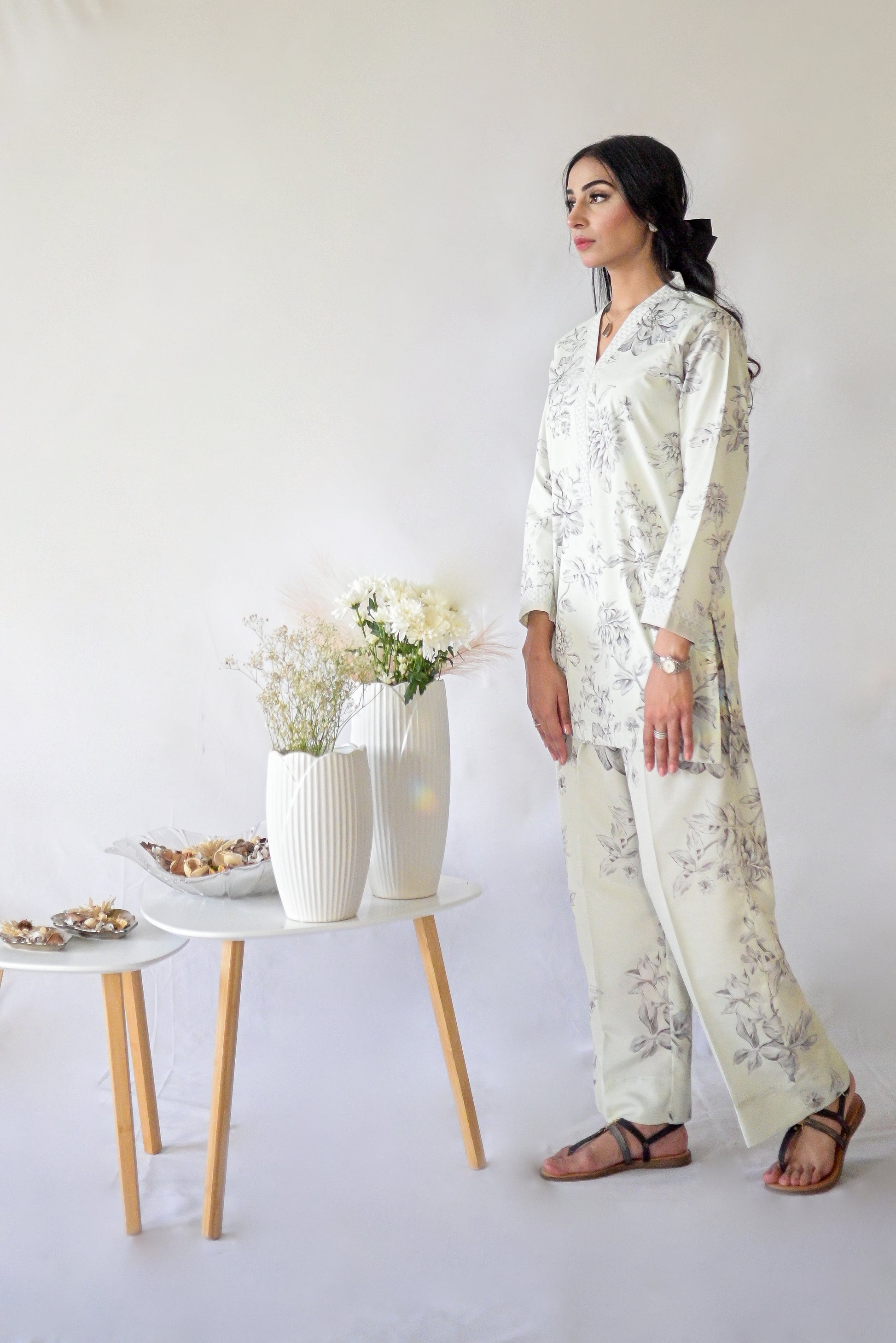 Introducing our exquisite ivory floral two-piece set! Crafted from silk lawn fabric, it offers luxurious comfort and style. The short shirt features a chic ban neckline, full-length sleeves. Paired with elegant culottes trousers with a delightful floral print on sides.