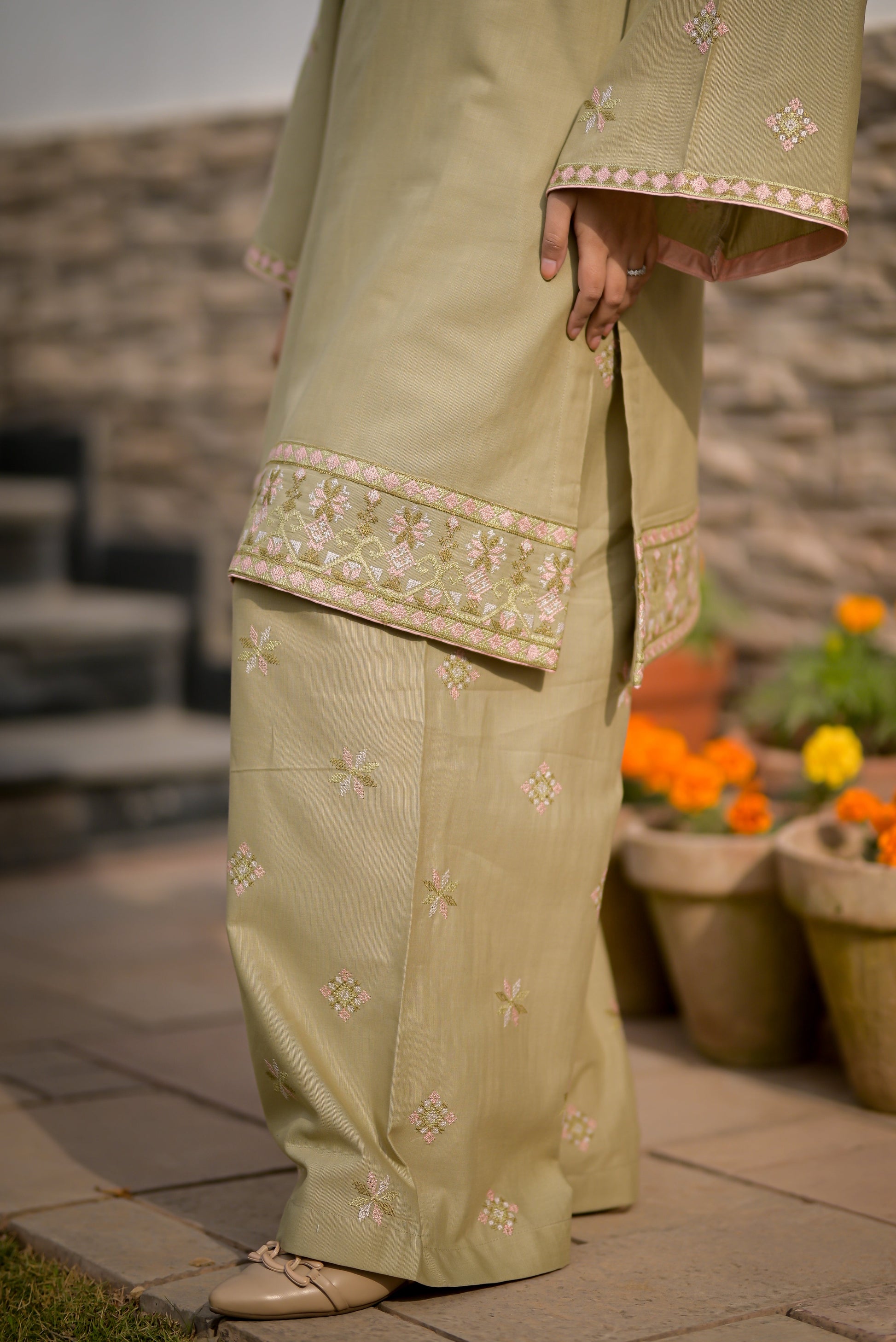 A soft pistachio green co-ord set with cross-stitch embroidery adorning the shalwar, shirt hem, and sleeves. The loose shalwar and short shirt bring a breezy yet refined charm to your wardrobe.